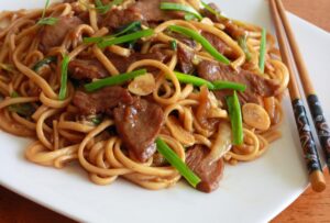 Beef Lo Mein. My go-to cheap late-night dinner choice in college, and probably one of the more popular choices on your average takeout menu. This is a home-cooked version that tastes awesome, while using more vegetables and less oil. Yay!