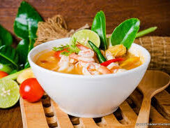 Thai green curry shrimp is a fast, 25-minute, one-pan dish made by sautéing green curry paste in coconut milk to release its aroma, then simmering it with coconut milk, fish sauce, sugar, vegetables (like zucchini or bamboo shoots), and quick-cooking shrimp. It is typically finished with aromatic Thai basil leaves and lime juice, served with rice.
